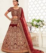 •Steal the show by wearing this maroon bridal traditional lehenga in velvet material heavily embellishes with thread, zari, dori, and sequin embroidery work comes with an attached can-can.