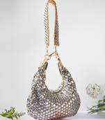 Gold Soft Purse, adorned with mesmerizing round-shaped brown smoky rhinestones meticulously arranged all over. This luxurious accessory seamlessly combines elegance with a touch of earthy allure, making it a standout piece for any occasion. Crafted with meticulous attention to detail, this purse features a convenient zip closure. Adding to its charm is a hand-embroidered and embellished handle, crafted with intricate detail and craftsmanship, making it a true work of art.