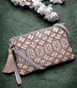 Silver & Multi Sling Bag from Anekaant's Kooky Collection. Crafted with Polycotton fabric, this Sling Bag features a Geometric Embellished Pattern decorated with Tassels. It has 1 main compartment secured with a Zipper closure. Has 1 Inner Patch Pocket and 1 Zip Pocket to organize your essentials. Includes a Detachable Wrist Loop and an Adjustable & Detachable Sling strap to carry it both as a Clutch or a Sling. Dimensions (LxHxW) : 28 x 18 x 2 cm