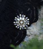 Classic ring never goes out of style, and this handcrafted masterpiece is a testament to that. The timeless beauty of grey colored precious stones and intricate purple kundan work, combined with a delicate floral motif, makes this piece both elegant and durable. Whether you're dressing up in traditional attire or contemporary wear, this versatile accessory is sure to elevate your look. Invest in the enduring charm of classic jewelry and add this exquisite piece to your collection today.