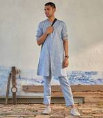 A relaxed yet refined piece that's anything but average. This kurta is poised to become the signature style staple in your wardrobe. Its no-collar design, contrasting color peeking from the stylish long placket that conceals the buttons within, exudes sophistication with a modern twist. Paired the kurta with a matching pyjamas for a formal yet contemporary look, the pyjama has intricate stitch detailing and can be worn with any other outside as well. It has pockets on the side and on the back. The comfortable elasticated waist band has an additon of drawstring for adjustments.