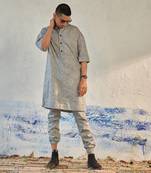 Crafted from traditional textured cotton, this kurta is reimagined with a sense of ease and spontaneity, offering both comfort and style. Boasting a broad, elongated front placket with a diagonal finish, adorned with bold black buttons for a contemporary touch. Black thread detailing on the placket adds a modern outlook. Paired with a matching Joggers which can be used for combining with any other tee or shirt as one may like. The joggers feature an elasticated waist with a drawstring and stylish metal accents and has subtle details for visual appeal.