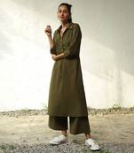 Prepare for a jungle exploration with our forest green front-buttoned co-ord set. Crafted from premium cotton poplin fabric, the kurta boasts a collared neckline and high side slits, forming a relaxed silhouette. The shell buttons and side seam pockets add a touch of elevated style. Paired perfectly with canoopi's drawstring pleated pants, featuring a comfortable elasticated waistband and inward box pleats that lead to wide legs, creating a breezy silhouette. Enjoy exploration in comfort and style.