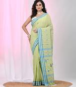 Light Green Cotton Saree With Bird Motifs And Blue Stripes