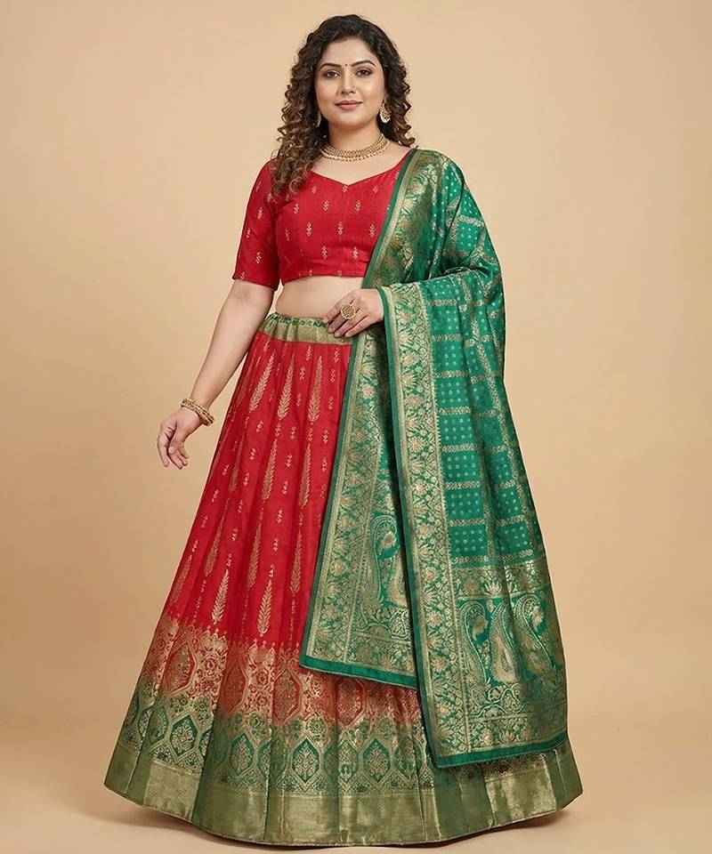 • Style : A Line Lehenga • Fabric : Art Silk • Color : Red • Work : Woven Blouse Details