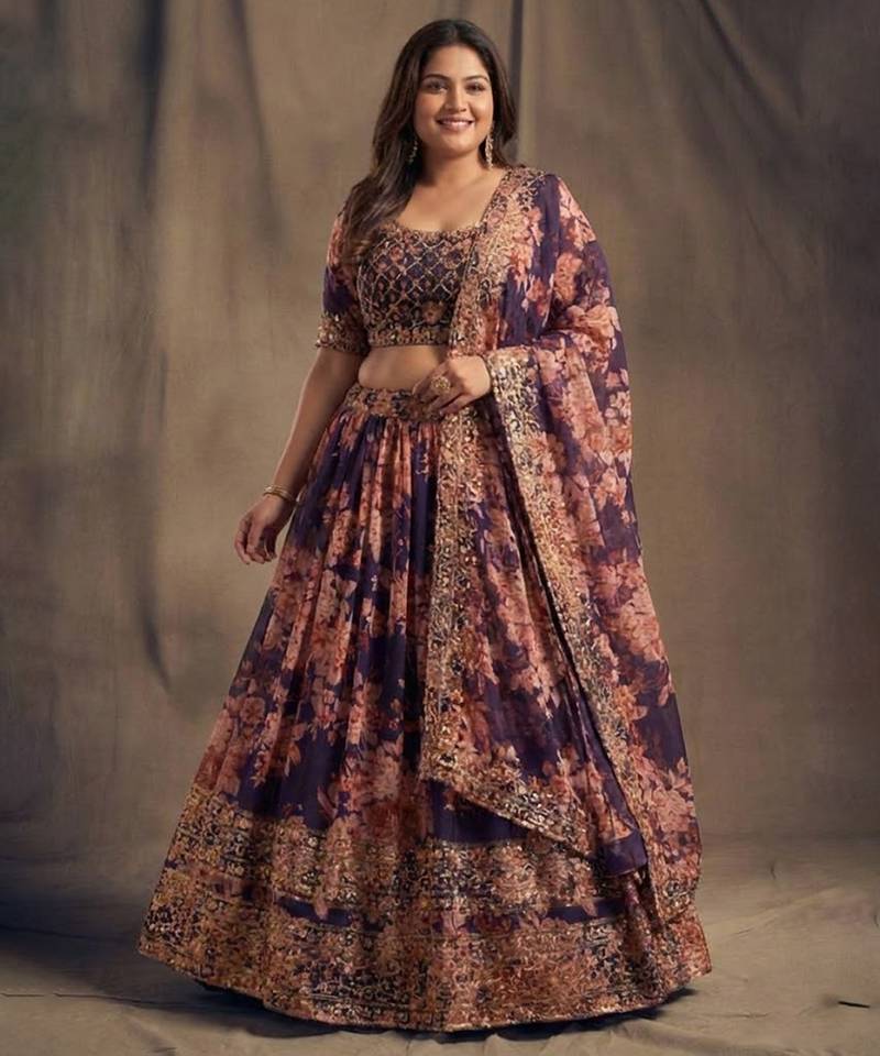 • Dupatta : Color- Purple / Fabric- Organza Lehenga Details
