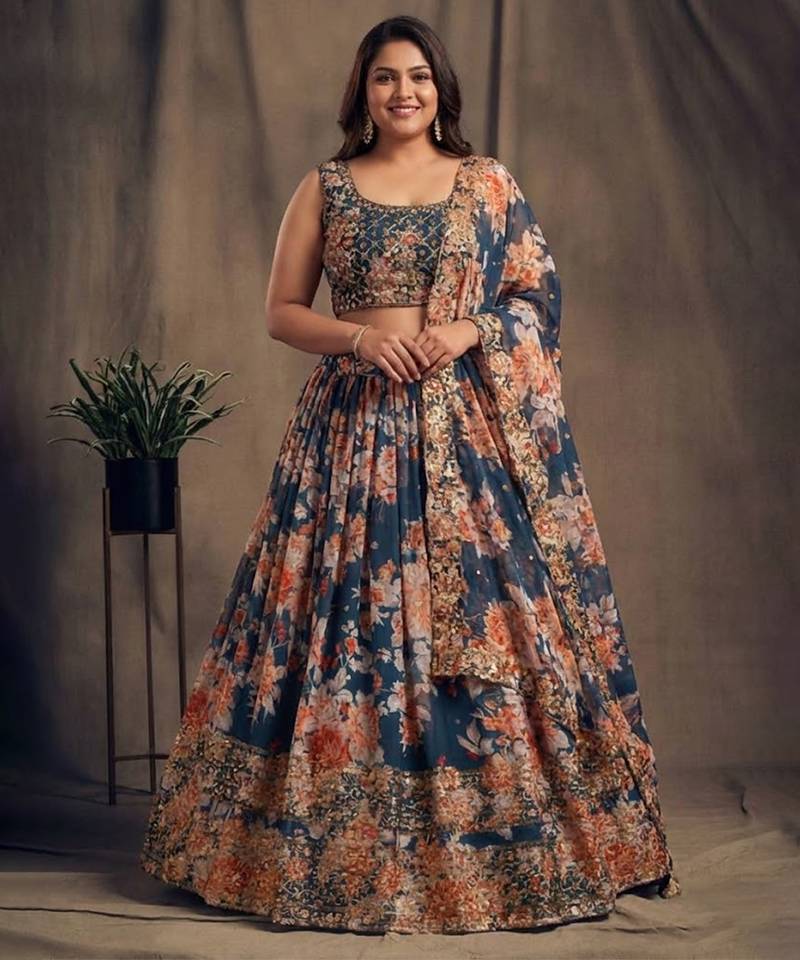 Maximum measurements: Bust: 58 inches, Waist: 50 inches, Hip: 60 inches"Lehenga: Crafted in dark teal soft organza fabric and Features a multicolor floral rose print. Adorned with golden zari and sequin embroidery along the broad border, Semi-stitched with a 3.50-meter flair