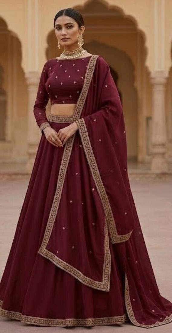 • Style : Circular Lehenga • Fabric : Georgette • Work : Embroidered • Color : Wine Dupatta Details