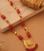 This beautiful necklace features rich coral beads, elegantly strung together to highlight a divine Laxmi pendant at its center. The vibrant coral beads symbolize protection and vitality, while the intricately crafted Laxmi pendant, representing prosperity and abundance, adds a spiritual touch to the piece. The combination of the bold coral hues with the sacred symbol creates a necklace that is not only a statement of style but also a meaningful accessory. Perfect for special occasions or as a treasured gift, this necklace brings together tradition and elegance in a unique design.