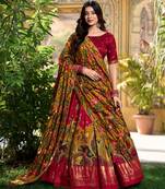 This eye-catching lehenga showcases the richness of Indian tradition with intricate Kalamkari inspired prints in bold shades of red, mustard yellow, green, and black. The flared skirt features detailed folk art motifs, creating a visually striking and culturally rooted ensemble. Complemented by a maroon blouse and matching dupatta adorned with similar artwork, this lehenga.