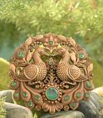 Celebrate the elegance of Indian royalty with the Emerald Peacock Splendor Brooch. This intricate accessory features a pair of majestic peacocks, surrounded by a flourish of delicate foliage and adorned with resplendent emerald-hued stones. The brooch is lightweight and versatile, making it an exquisite addition to your coat, jacket, or bandhgala, perfect for those who wish to showcase a touch of regal charm and sophistication.