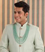 Royal courage mala features a multi layered sea green beads mala.