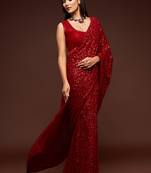 Ruby Red Thread And Multiple Sequins Embroidered Georgette Party Wear Bridal Wedding Festival Designer Saree