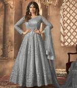 Grey Net Anarkali Embroidered Work Festival Long Salwar Suit Dupatta Semi stitched