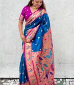 This blue paithani saree, crafted from luxurious silk fabric, is a true work of art. Designed with intricate zari woven borders, it exudes a regal charm, while the gold-toned swan print all over adds a touch of opulence and traditional beauty. The rich texture and vibrant colors make this saree perfect for festive occasions and cultural celebrations. Indulge in timeless elegance shop now and make this stunning paithani silk saree yours.