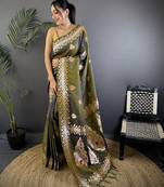 Elevate your ethnic wardrobe with the Banarasi saree in Mahendi green, blending tradition and sophistication. This luxurious soft silk Banarasi saree is ideal for bridal wear, festive celebrations, or cultural events, offering unmatched elegance and style.Specifications [-]