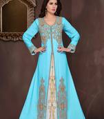 • Product Id : 4342628 • Package Details : 1 Kaftan With Hijab • Type : Kaftans • Occasion : Ceremonial • Fabric : Georgette • Work : Embroidered • Type : Zari Work • Look : Designer • Sleeve : Full Sleeve • Neck Style : V Neck • Color : Cyan • Stitching : Stitched • Height : 60 Stitching [+]