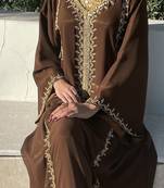 • Product Id : 4380573 • Package Details : 1 Dress • Type : Kaftans • Occasion : Casual • Fabric : Georgette • Work : Embroidered • Type : Zari Work • Look : Fashion • Sleeve : Full Sleeve • Neck Style : V Neck • Color : Brown • Stitching : Stitched Stitching [+]