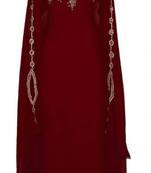 Exude regal elegance in this magnificent maroon kaftan, crafted from fluid georgette that drapes beautifully. Lavish gold-toned zari work and dense bead and stone embellishments create a brilliant play of sparkle, especially around the high neckline, chest, and shoulders. The long and wide sleeves are a standout feature, adorned with cascading strands of embellishments. Fully stitched and ready to wear, this kaftan is perfect for weddings, festive celebrations, or any grand occasion.