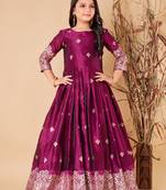 Dress your little princess in this stunning wine-colored silk Anarkali gown, designed to exude grace and charm. Crafted from rich silk fabric, this full-length gown features delicate golden motifs scattered across the bodice and skirt, adding a regal touch. The three-quarter sleeves are beautifully adorned with intricate golden embroidery, perfectly complementing the heavy embroidered border at the hem.