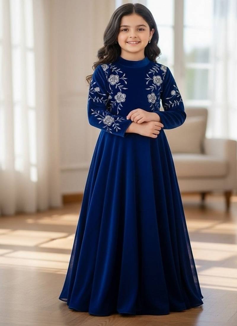 • Product Id : 4663501 • Package Details : 1 Gown • Type : Ethnic Dresses • Work : Embroidered • Type : Sequins Work • Look : Traditional • Sleeve : Full Sleeve • Neck Style : Round Neck • Bottom Fabric : Velvet • Bottom Color : Royal Blue • Top Color : Blue • Top Fabric : Velvet • Stitching : Stitched • Gender : Girl Payments [+]