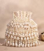 Zarah Ivory Pearl Embellished Potli is a beautifully hand-crafted Potli with pearls, delicate handmade pearl tassels at the bottom and a pearl beaded handle. The Pearl latkans attached to the suede base exude luxury. Crafted from high-quality materials, this Potli is built to last. This collectable statement accessory fits your valuables like a smartphone, makeup, keys, currency and cards. Product colour may slightly vary due to photographic lighting sources or your monitor settings.