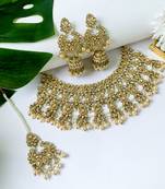 The gold-plated choker necklace set consists of a necklace, a pair of earrings, and a maang tikka. The necklace features kundan studded with pearl beaded in it, giving it an elegant and traditional look. The stones and pearls are set in a beautiful pattern, adding a touch of sophistication and grace to the necklace. The necklace is secured with drawstring closures, which make it easy to adjust the size to fit comfortably around the neck. This is an important feature, as it ensures that the necklace will be comfortable to wear for extended periods of time. The necklace is secured with drawstring closures, which make it easy to adjust the size to fit comfortably around the neck. This is an important feature, as it ensures that the necklace will be comfortable to wear for extended periods of time. The earrings and maang tikka are also adorned with stones and pearls, which match the pattern of the necklace. The earrings have a beautiful design, which makes them easy and comfortable to wear. The maang tikka is a traditional Indian hair accessory that can be worn with the necklace and earrings to complete the look.