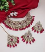 • Product Id : 4342268 • Package Details : 1 Necklace/1 Pair Of Earring/1 Maang Tikka. • Type : Necklace Sets • Look : Traditional • Jewellery Work : Gold Plated • Color : Pink • Plating : Yellow Gold • Base Material : Alloy • Pearl Type : Na • Pearl Shape : Na • Height : 10.0 • Width : 5.5 • Care : Keep The Jewelry Away From Direct Heat, Water, Perfumes, Deodorants And Other Strong Chemicals As They May React With The Metal Or Plating. Store The Jewelry When Not In Use In A Storage Box Or A Cloth Pouch To Retain Its Shine. Payments [+]