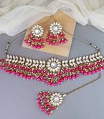 Traditional Kundan Pearl Hanging Choker Necklace Jewellery Set With Earrings & Maang Tikka