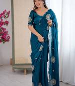 Designer Teal Heavy Fendy Satin With Beads Embroidered Work Saree With Unstitched Blouse