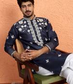 Channel elegance and charm with this Blue Cotton Kurta, beautifully elevated with white floral thread embroidery. The intricate work along the placket and shoulders adds richness, while scattered embroidered motifs lend subtle sophistication. A striking embroidered back panel further enhances its statement look. Designed with a mandarin collar and button-down placket, this kurta is an ideal pick for weddings, receptions, and festive evenings. Pair it with white churidar or trousers for a bold and classic ethnic style.