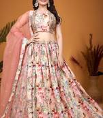 • Style : A Line Lehenga • Fabric : Silk • Color : Peach • Work : Floral Print Blouse Details