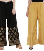 MENSIMPRESSION Women Black & Peach Color solid Gold Print Flared Palazzo-Pants Combo. The Stylish Flared Gold Print Palazzo Made Of Rayon Fabric With Full Elastic At The Waist Size is Free Size (Waist :- 28 Inch, Lenth :- 38 Inch). Which Makes Comfortable For Wearing. A Beautiful Gold Print Designed At The Lower Part Of Bottom Add Grace To Your Personality. It Is Ideal With Kurti, Top And T Shirt Etc.Perfect Finishing And Good Quality Palazzo,Keep Your Style Breezy And Chic.