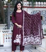 • Product Id : 4520939 • Package Details : 1 Kurta/1 Palazzo/1 Dupatta • Type : Readymade Suits For Women • Region : India • Type : Floral Print • Look : Fashion • Sleeve : Quarter Sleeve • Neck Style : Round Neck • Fabric : Cotton • Color : Wine • Work : Floral Print • Stitching : Stitched Payments [+]