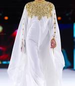 Fabric & Design: This stunning white kaftan is crafted from lightweight georgette, providing a soft and flowing silhouette that is perfect for party wear. The fabric features exquisite heavy gold zari embroidery around the collar neck, creating a luxurious and eye-catching design. The intricate embroidery flows elegantly, enhancing the kaftan's overall appeal and making it a standout piece for weddings and special occasions.