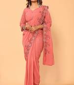 Ready To Wear Designer Georgette Peach Floral Embroidery Saree With Embroidery Work Unstitched Blouse Piece