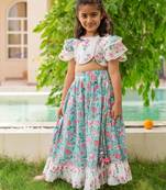Blue Cotton Printed Blouse And Lehenga For Girls