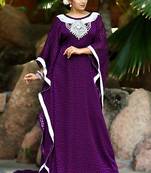 Unveil your inner royalty with this exquisite Violet Crepe Kaftan, intricately adorned with embroidery and dazzling stone work. The smooth crepe fabric drapes effortlessly, offering a flattering silhouette and luxurious comfort. Its statement embellished neckline with glimmering stones adds a regal touch, while the flowing sleeves trimmed with elegant white borders elevate the overall charm. Perfect for festive gatherings, evening soirees, or wedding celebrations, this kaftan blends traditional craftsmanship with contemporary grace.