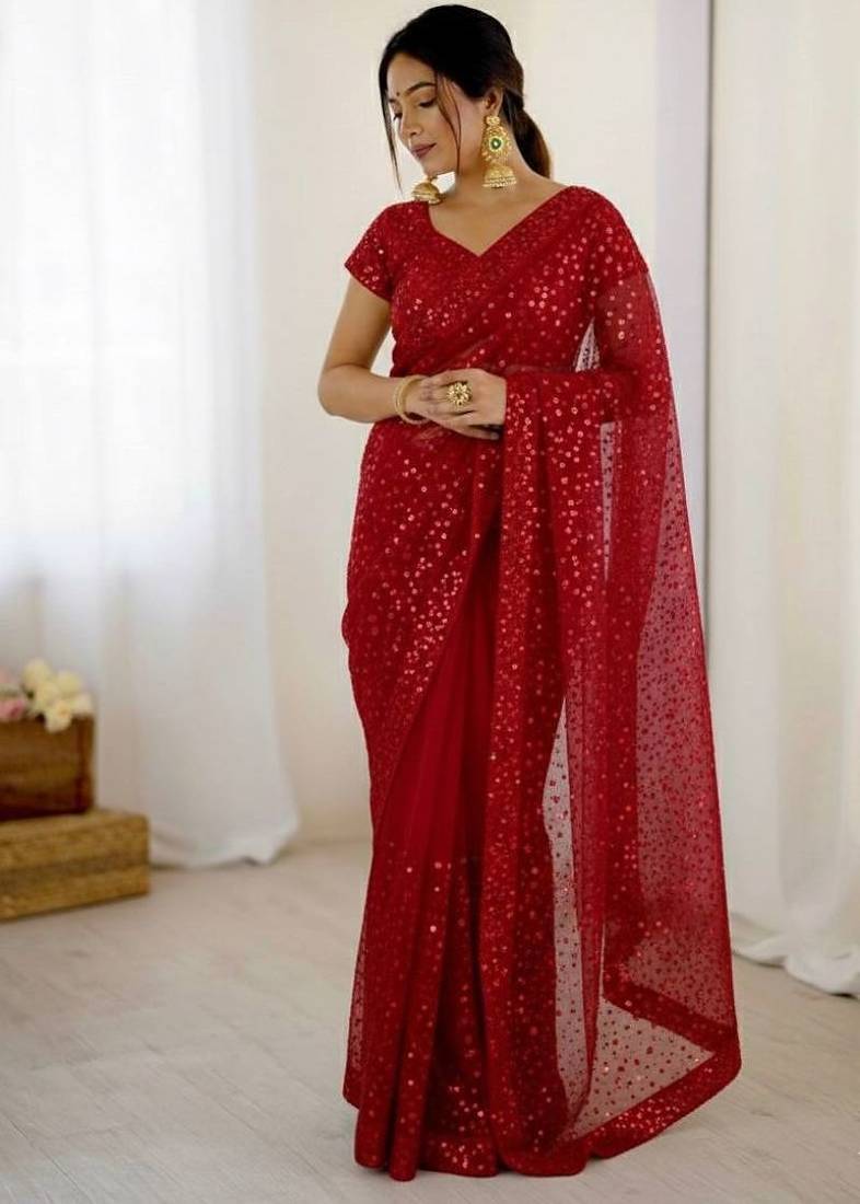 Premium Red Net Saree With Sequins & Dori Work