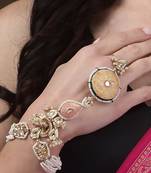 The "Majestic Gleam Kundan Hathphool" is a collaboration of the beauty of the Meenakari metalworking and Kundan gem setting, which is a bold alloy of the breathtakingly colorful epoxy coating and the traditional design. This attractive focal element of a regal appearance delivered for any public performance combines the motifs of spatial nature and rich color that are used. Fashion seasonal celebrations today stand as the unclear merger of tradition and contemporary sophistication.; Category Of Jewellery is Hand Jewellery; Sub Category is Hath Phool; Ideal For Women; Color is Pink, Cream, Gold, White; Gemstones Used - Kundan, Pearls, Natural Stones; Plating is Gold-Plated; Base Metal is Alloy; Other Material Used - Adjustable Chain; Size is Freesize; Adjustable - Yes; Weight is 41 gms; Mesaurements - Length of Hathphool Chain= 12 CM; Width of Hathphool Chain =3.5 CM; Width of Hathphool = 2.5 CM; Diameter of Hathphool =6.03 CM; Circumference of Hathphool = 18.95 CM; Adjustable - Yes; Content 1 Hathphool