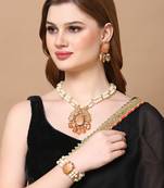 peach and gold neck pc and pearl look; Category Of Jewellery is Jewellery Set; Sub Category is Necklace with Earring; Ideal For Women; Color is Orange, Cream, White, Gold, Peach ; Gemstones Used - Pearls, Kundan, Natural Stones ; Plating is Gold-Plated; Base Metal is Alloy; Other Material Used - Adjustable Dori; Size is Freesize; Adjustable - Yes ; Weight is 106 gms; Mesaurements - Length of Earring= 5 CM; Width of Earring =3 CM; Length of Necklace =58 CM; Width of Necklace = 8 CM; Adjustable - Yes ; Content 1 Necklace 1 Pair Earring