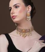meenakari and kundanpc with real sputh sea looking pearls styled; Category Of Jewellery is Jewellery Set; Sub Category is Chokar with Earrings; Ideal For Women; Color is Orange, Peach, Maroon, Cream, Brown, White; Gemstones Used - Kundan, Pearls, Natural Stones; Plating is Gold-Plated; Base Metal is Alloy; Other Material Used - Adjustable Dori; Size is Freesize; Adjustable - Yes ; Weight is 113 gms; Mesaurements - Length of Earring= 7.5 CM; Width of Earring =4 CM; Length of Necklace =46 CM; Width of Necklace = 5 CM; Adjustable - Yes ; Content 1 Necklace 1 Pair Earring
