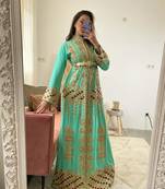 Drape yourself in long-lasting elegance with this Royal Mint Green Kaftan, designed for the modern woman who cherishes tradition. This kaftan for women showcases a breathtaking blend of intricate aari embroidery and regal color play. Crafted from lightweight net fabric, it features detailed gold and maroon threadwork in traditional patterns that exude richness and sophistication. The net kaftan figure-enhancing belt and full-length silhouette offer a flattering fit, making it a perfect pick for weddings, Eid, or festive soirées. This embellished kaftan promises to make every occasion grand and unforgettable.