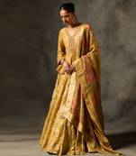 Irja is a set of full sleeved peplum choli paired with a tissue jacquard lehenga and a printed dupatta. The season's signature kamal motif features on the bottoms and dupatta along with lotus-shaped tassels, while cord and sequin embroidery highlights the choli neckline.