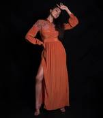 Sundial Long Dress Featuring A High Slit And Tulle Applique Embroidery Colour : Orange