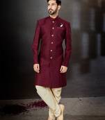 • Product Id : 4527247 • Package Details : 1 Indowestern Sherwani / 1 Dhoti • Type : Sherwani • Fabric : Jacquard • Work : Embroidered • Look : Designer • Sleeve : Full Sleeve • Color : Maroon • Bottom Fabric : Dupion Silk • Bottom Color : Gold • Top Color : Maroon • Top Fabric : Jacquard • Bottom Style : Dhoti • Stitching : Stitched Payments [+]