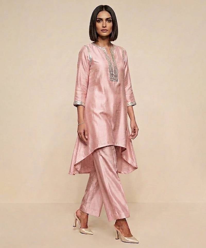 Components: 1 Kurta :: 1 Pant• Product Id : 4742389 • Package Details : 1 Kurta / 1 Pant • Type : Plus Size Kurtis • Work : Embroidered • Type : Mirror Work • Look : Traditional • Sleeve : Quarter Sleeve • Fabric : Raw Silk • Color : Pink • Stitching : Stitched • Length : 35.0 General - Color and Texture may have slight variation. This happens because of photography.