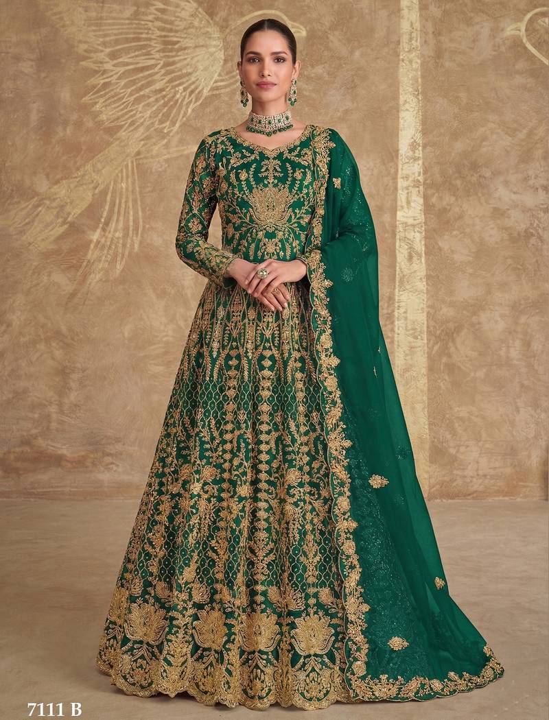 Green Net Anarkali Salwar Suit Gown Semi stitched