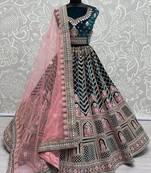 Dress gorgeous and traditional on your memorable day with this teal blue color velvet bridal lehenga. It features exquisite embroidered work, fancy dori work, multi-thread work, and diamond work, adding a touch of luxury to your attire. The lehenga is semi-stitched up to 42 inches, while the choli is made from similar color velvet material and comes as un-stitched 1. 00-meter material. Complete your look with a pink color net dupatta, adorned with four side embroidered work and a gorgeous heavy lace border. This glamorous lehenga choli set is perfect for weddings and can be customized to your preferences. Bring some traditional glam to your feed and make a statement.