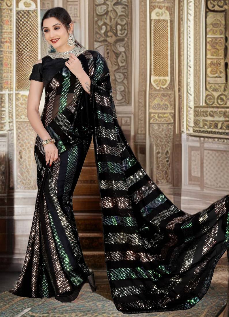 Black Sequenced Embriodered Georgette Saree With Blouse Piece.